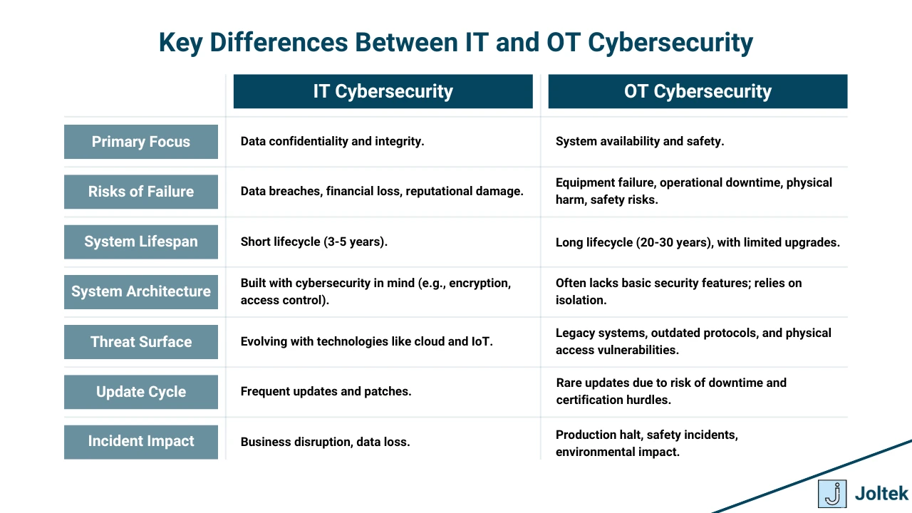 Unlike traditional IT cybersecurity, ICS cybersecurity prioritizes the physical processes and equipment that drive production and service delivery. The goal is not just to prevent unauthorized access but to ensure continuous operations, protect worker safety, and maintain the integrity of physical assets.